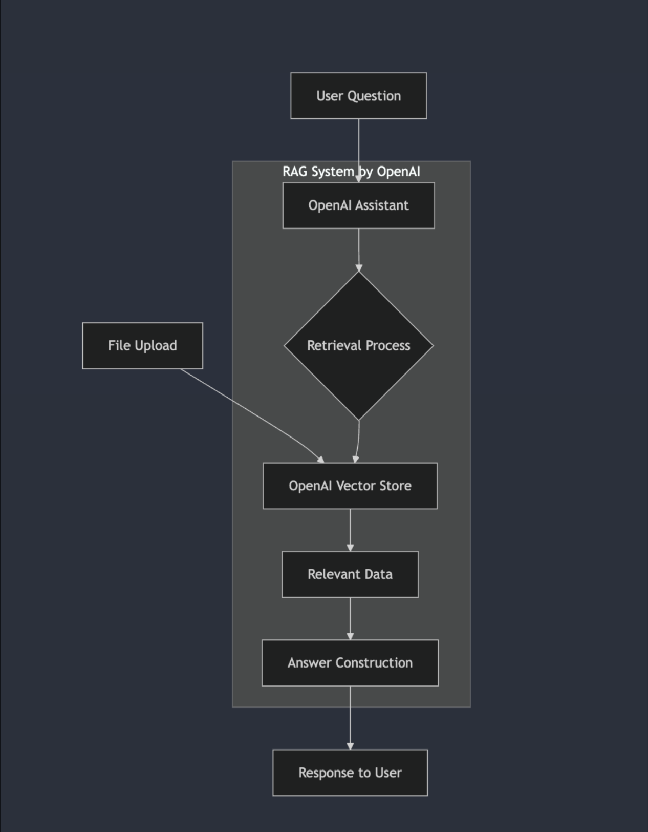 When a user asks a question, the query is sent to the OpenAI assistant along with relevant context from the vector store. The assistant retrieves the relevant data from the vector store to answer the question and constructs the final response.